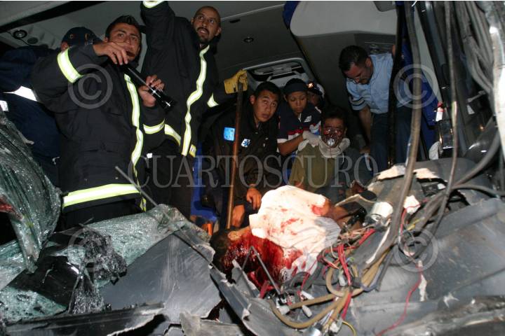 ECATEPEC, ESTADO DE MEXICO 23SEPTIEMBRE2008.- Esta madrugada un elefante que escapo de las bodegas del circo Union, murio al ser embestido por un autobus de la linea México Teotihuacan en el kilómetro 1 de la autopista México-Piramides, dejando como saldo, el conductor del autobus de nombre; Tomas López Duran y el elefante muerto por el impacto.En la imágen, cuerpos de rescate tratando de sacar el cuerpo del conductor prensado. FOTO: LUZ ACEVEDO/CUARTOSCURO.COM