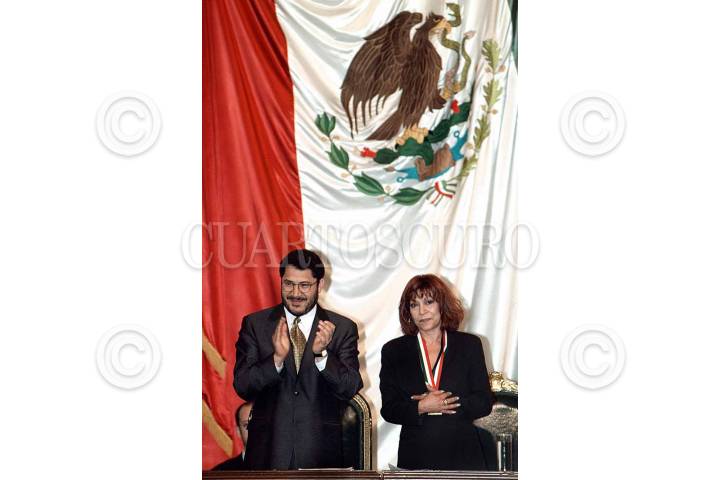 Cristina Pacheco (der) y Rosario Robles (izq) durante la entrega de la medalla al mérito ciudadano que otorgó la Asamblea Legislativa a una de las cronistas más activas de la capital.