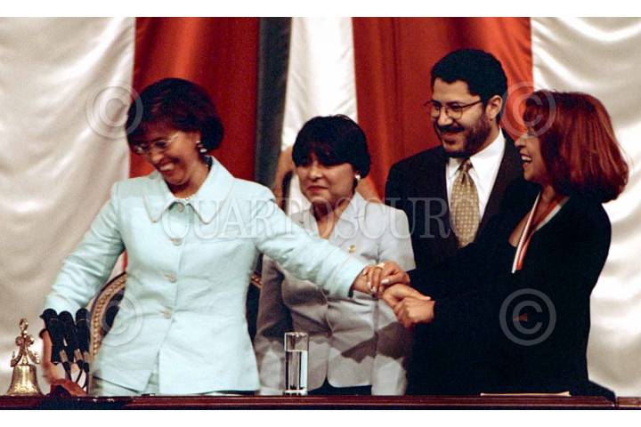 Cristina Pacheco (der) y Rosario Robles (izq) durante la entrega de la medalla al mérito ciudadano que otorgó la Asamblea Legislativa a una de las cronistas más activas de la capital.