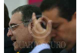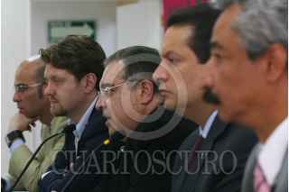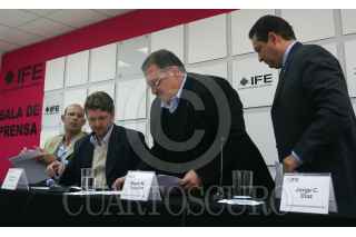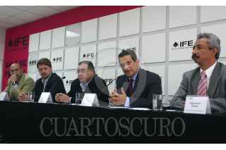 MÉXICO, D.F., 29SEPTIEMBRE2008.- El partido Socialdemocrata ofreció una conferencia de prensa donde dio a conocer un acuerdo con el consejo general del Instituto Federal Electoral IFE para proponer que el Centro de Investigación y Seguridad Nacional CISEN investigue y someta a revisión a candidatos de su partido para verificar que no tengan nexos con el narcotráfico. En la imagen David Razo, Luciano Pascoe Miguel M. Gonzalez y Jorge Diaz Cuervo. FOTO: SAÚL LÓPEZ/CUARTOSCURO.COM