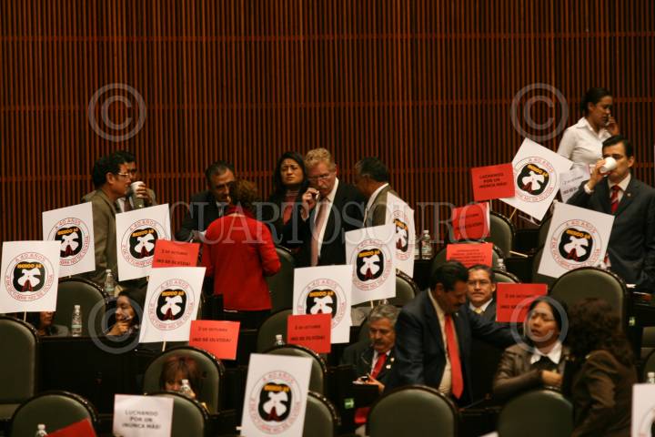 MÉXICO, D.F., 02OCTUBRE2008.- Se realizó la sesión ordinaria en la Cámara de Diputados, donde se recordó el 40 Aniversario de la Matanza Estudiantil del 2 de Octubre de 1968 en la Plaza de las Tres Culturas, a la sesión asistió, José Narro, Rector de la UNAM y donde diputados del PRD, mostraron banderines con la leyenda “A 40 Años, 2 de Octubre No se olvida”. En la imágen; los diputados, así como los invitados guardan un minuto de silencio. FOTO: GUILLERMO PEREA/CUARTOSCURO.COM