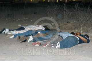 TIJUANA, BAJA CALIFORNIA, 02OCTUBRE2008.- Con el tétrico hallazgo de nueve personas asesinadas esta madrugada, se alcanzó la cifra de 402 ejecutados en lo que va del año en Tijuana. Cantidad muy superior a las 335 ejecuciones cometidas aquí el año pasado. A las tres horas con treinta minutos un reporte telefónico al 066 movilizó a las autoridades hasta la parte posterior del Parque Industrial Pacífico. En un lote baldío, cerca de la entrada al fraccionamiento Barcelona Residencial, los uniformados vieron con estupor ocho cadáveres colocados boca abajo, en una ordenada fila. Todos tenían las manos atadas a la espalda y mostraban numerosos impactos de bala. Varios de ellos tenían dedos mutilados. Sus edades oscilan entre los 20 y los 30 años. Alrededor de los cadáveres las autoridades encontraron 69 casquillos de armas de diferentes calibres, principalmente de “cuernos de chivo”, lo que demuestra que allí fue la masiva ejecución. FOTO: EL-MEXICANO/CUARTOSCURO.COM