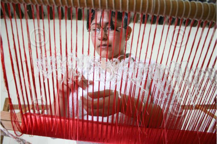 SANTA MARÍA DEL RÍO, SAN LUIS POTOSÍ, 07OCTUBRE2008.- En Santa María existe desde 1953 un Taller del rebozo, donde se enseña esta artesanía, ahí se puede observar como se elabora un rebozo, procedimiento que dura de 30 a 60 días y constituye 15 pasos, que incluye el devanado, urdimbre y teñido del hilo, el tejido que se hace en un telar de cintura, y el enpuntado, que es el delicado tejer de los hilos en forma de rombo a cada extremo, a esa parte de la prenda se le llama rapacejo. Una vez terminado, se plancha en una prensa de madera, fase final de la elaboración del rebozo de Santa María, que engalana a la mujer mexicana y que es orgullo de México y del estado de San Luis Potosí. FOTO: RICARDO CASTELAN/CUARTOSCURO.COM