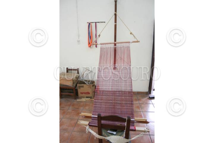 SANTA MARÍA DEL RÍO, SAN LUIS POTOSÍ, 07OCTUBRE2008.- En Santa María existe desde 1953 un Taller del rebozo, donde se enseña esta artesanía, ahí se puede observar como se elabora un rebozo, procedimiento que dura de 30 a 60 días y constituye 15 pasos, que incluye el devanado, urdimbre y teñido del hilo, el tejido que se hace en un telar de cintura, y el enpuntado, que es el delicado tejer de los hilos en forma de rombo a cada extremo, a esa parte de la prenda se le llama rapacejo. Una vez terminado, se plancha en una prensa de madera, fase final de la elaboración del rebozo de Santa María, que engalana a la mujer mexicana y que es orgullo de México y del estado de San Luis Potosí. FOTO: RICARDO CASTELAN/CUARTOSCURO.COM