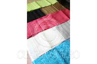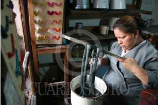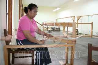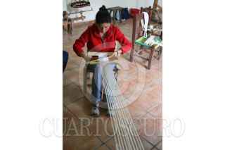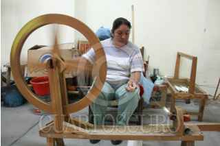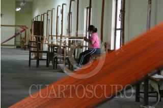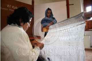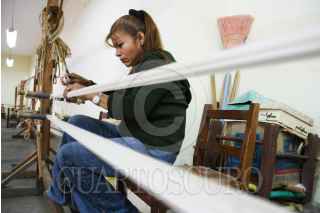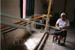 SANTA MARÍA DEL RÍO, SAN LUIS POTOSÍ, 07OCTUBRE2008.- En Santa María existe desde 1953 un Taller del rebozo, donde se enseña esta artesanía, ahí se puede observar como se elabora un rebozo, procedimiento que dura de 30 a 60 días y constituye 15 pasos, que incluye el devanado, urdimbre y teñido del hilo, el tejido que se hace en un telar de cintura, y el enpuntado, que es el delicado tejer de los hilos en forma de rombo a cada extremo, a esa parte de la prenda se le llama rapacejo. Una vez terminado, se plancha en una prensa de madera, fase final de la elaboración del rebozo de Santa María, que engalana a la mujer mexicana y que es orgullo de México y del estado de San Luis Potosí. FOTO: RICARDO CASTELAN/CUARTOSCURO.COM
