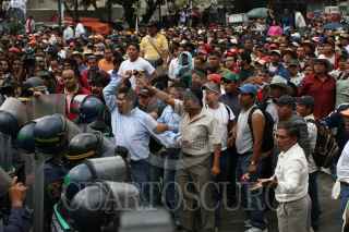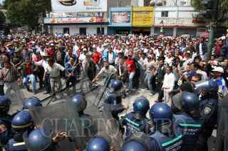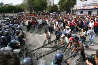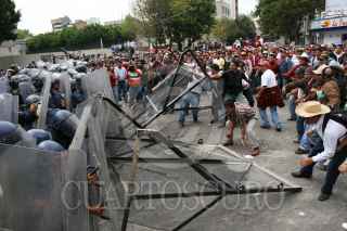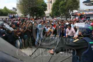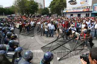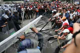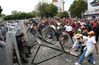 MÉXICO D.F., 08OCTUBRE2008.-Maestros integrantes de la CNTE, protestaron a las afueras de la Secretaría de Gobernación, a la cual intentaron entrar enfrentándose y aventado las vayas metálicas colocada por los elemento de la Secretaria de Seguridad que resguardan estas instalaciones. FOTO: GUILLERMO PEREA/CUARTOSCURO.COM