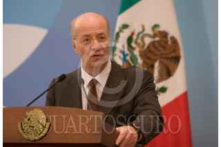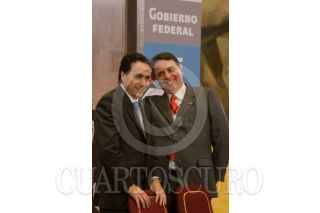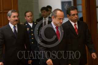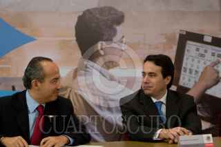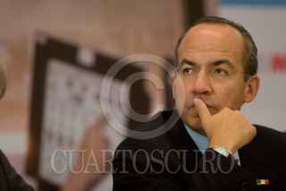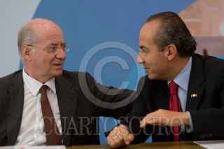 MÉXICO, D.F., 08OCTUBRE2008.- Paolo Rocca, Presidente del Grupo Techint y Felipe Calderón Hinojosa, Presidente de México, conversan durante el anuncio que se realizó en la residencia oficial de Los Pinos "Creciendo con México". FOTO: MOISÉS PABLO/CUARTOSCURO.COM
