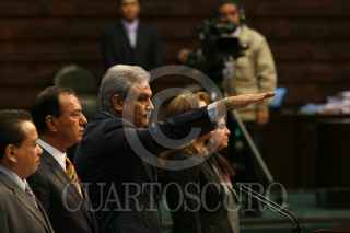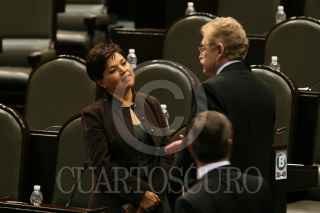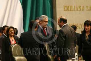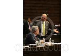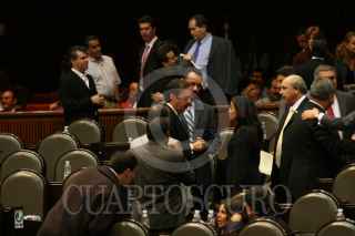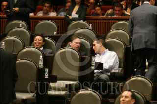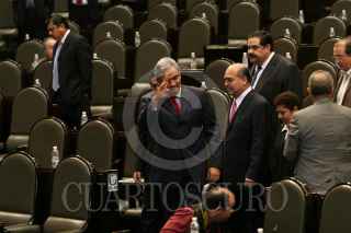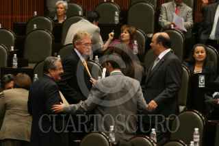 MÉXICO D.F., 09OCTUBRE2008.- Alberto Cárdenas. titular de la SAGARPA, acudió esta tarde a comparecer ante la Cámara de Diputados durante la sesión del día de hoy. En la imagen el diputdo Emilio Gambo Patrón, dialoga con José Emilio Gónzalez del PVM. FOTO: GUILLERMO PEREA/CUARTOSCURO.COM