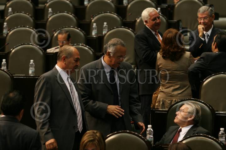 MÉXICO D.F., 14OCTUBRE2008.- Se realizó la sesión ordinaria en la Cámara de Diputados. En la imagen, Ismael Hernádez Deras, Gobernador del Estado de Durango, quien acudio esta tarde a la Cámara de Diputados saluda a diputados del PRI, entre ellos Emilio Gamboa Patrón. FOTO: GUILLERMO PEREA/CUARTOSCURO.COM