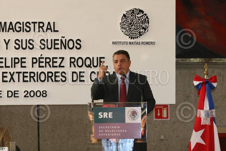 MÉXICO, D.F., 20OCTUBRE2008.- Felipe Pérez Roque, Canciller de la República de Cuba, durante la conferencia magistral que ofreció esta tarde en instalaciones de la Secretaria de Relaciones Exteriores. En la imagen el canciller es acompañado de María Celia Toro Directora del Instituto Matías Romero. FOTO: GUILLERMO PEREA/CUARTOSCURO.COM