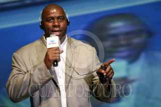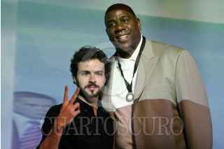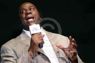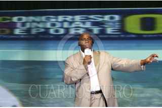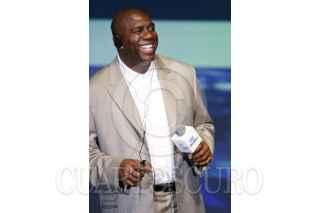 MÉXICO D.F., 24OCTUBRE2008.- El diseñador Jose Maria Torre entrego una medalla como reconocimento a el ex basquetbolista estadounidense de la NBA, Earving "Magic" Johnson, que ofrecio una conferencia magistral dentro del segundo día de actividades del 1er Congreso Mundial del Deporte 2008 que se realizará hasta este próximo sabado en el Centro Banamex. FOTO: RODOLFO ANGULO/CUARTOSCURO.COM