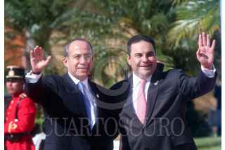 SAN SALVADOR, EL SALVADOR, 30OCTUBRE2008.- El presidente de México, Felipe Calderon Hinojosa, durante su arribo al "Centro Internacional de Ferias y Convenciones, quien lo recibió el presidente de El Salvador, Elias Antonio Saca, en el marco de la "XVIII Cumbre Iberoamericana. FOTO: ARIEL GUTIERREZ/CUARTOSCURO.COM