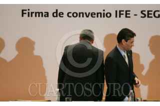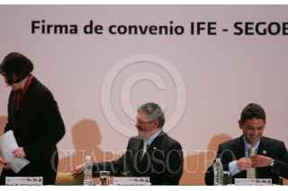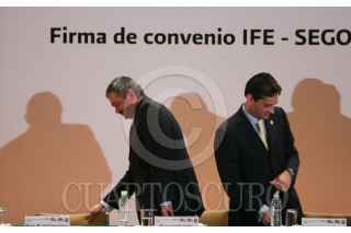 MÉXICO, D.F., 30OCTUBRE2008.- Leonardo Váldez, ministro presidente del Instituto Federal Electoral y Juan Camilo Mouriño, Secretario de Gobernación, Secretario de Gobernación, encabezaron la firma del Convenio del Fondo de Apoyo para la Observación Electoral 2008-2009, que se realizó en el Museo de Antropología. FOTO: MOISÉS PABLO/CUARTOSCURO.COM