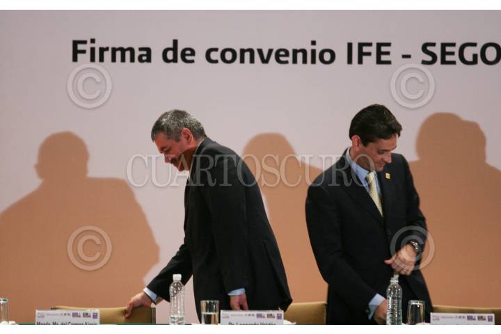 MÉXICO, D.F., 30OCTUBRE2008.- Leonardo Váldez, ministro presidente del Instituto Federal Electoral y Juan Camilo Mouriño, Secretario de Gobernación, Secretario de Gobernación, encabezaron la firma del Convenio del Fondo de Apoyo para la Observación Electoral 2008-2009, que se realizó en el Museo de Antropología. FOTO: MOISÉS PABLO/CUARTOSCURO.COM