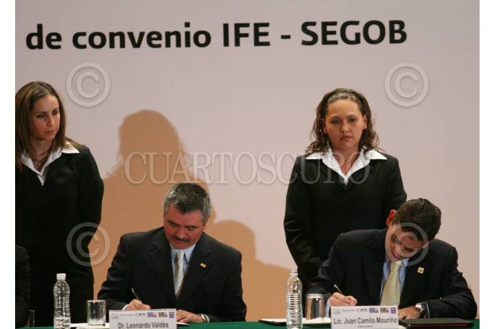 MÉXICO, D.F., 30OCTUBRE2008.- Leonardo Váldez, ministro presidente del Instituto Federal Electoral y Juan Camilo Mouriño, Secretario de Gobernación, Secretario de Gobernación, encabezaron la firma del Convenio del Fondo de Apoyo para la Observación Electoral 2008-2009, que se realizó en el Museo de Antropología. FOTO: MOISÉS PABLO/CUARTOSCURO.COM