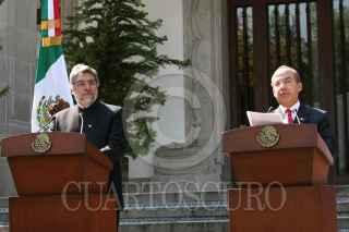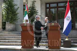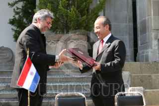 MÉXICO D.F., 03NOVIEMBRE2008.- El presidente, Felipe Calderón Hinojosa, acompañado de su homónimo de la República de Paraguay, Fernando Armindo Lugo Méndez, fueron testigo de honor de la firma de diversos convenios entre instituciones de ambos países, esto en las escalinatas de la residencia oficial de los Pinos. FOTO: GUILLERMO PEREA/CUARTOSCURO.COM