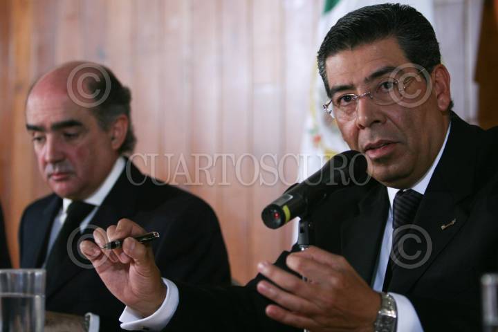 MÉXICO, D.F., 05NOVIEMBRE2008.- Gilberto López Meyer, director general de Aeropuertos y Servicios Auxiliares, Luis Tellez Kuenzler, Secretario de Comunicaciones y Transportes y Agustín Arellano Rodríguez, director general de Servicios a la Navegación en el Espacio Aéreo Mexicano, ofrecieron una conferencia de prensa para hablar sobre las posibles causas técnicas del accidente aereo en la colonia Lomas de Chapultepec en el cual murió Juan Camilo Mouriño, Secretario de Gobernación, precisó que no hay indicios para hablar de un atentado pues todo parece indicar que se trató de un accidente. FOTO: MOISÉS PABLO/CUARTOSCURO.COM
