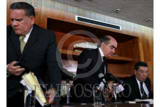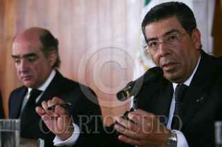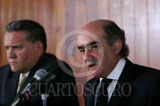 MÉXICO, D.F., 05NOVIEMBRE2008.- Gilberto López Meyer, director general de Aeropuertos y Servicios Auxiliares, Luis Tellez Kuenzler, Secretario de Comunicaciones y Transportes y Agustín Arellano Rodríguez, director general de Servicios a la Navegación en el Espacio Aéreo Mexicano, ofrecieron una conferencia de prensa para hablar sobre las posibles causas técnicas del accidente aereo en la colonia Lomas de Chapultepec en el cual murió Juan Camilo Mouriño, Secretario de Gobernación, precisó que no hay indicios para hablar de un atentado pues todo parece indicar que se trató de un accidente. FOTO: MOISÉS PABLO/CUARTOSCURO.COM