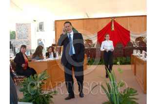 TEOTIHUACAN, ESTADO DE MÉXICO, 11NOVIEMBRE2008.- Por primera vez legisladores de la LVI legislatura mexiquense sesionó fuera del recinto legislativo, conforme a la ley orgánica del congreso que pide sesionar una vez al año en un sitio público con impacto cultural. Anteriormente de manera unánime los legisladores acordaron que la sede fuera Teotihuacan, según el decreto 220. De acuerdo a la orden del día empezaría a las 11 de la mañana y comenzó cerca de las 13 horas, pues la mayoría llegó tarde. Durante la sesión renunció a su cargo la consejera de derechos humanos, Sonia Silvia Vega y en su lugar fue nombrado, Juan Parem Yaquemin. FOTO: MARIO NULO/CUARTOSCURO.COM