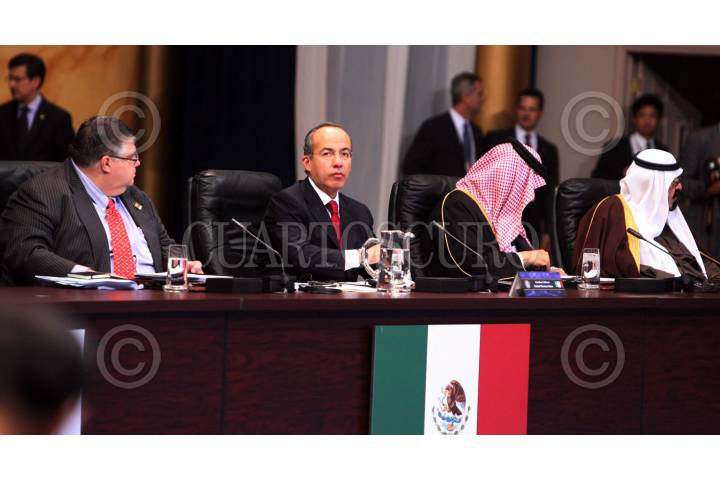 WASHINGTON D.C. 15NOVIEMBRE2008- Felipe Calderon Hinojosa, Presidente de México, acompañado Agustín Carstens, Secretario de Hacienda y Crédito Público, durante la primera sesión plenaria de los jefes de Estado y de Gobierno participantes en la reunión del G-20. FOTO: ARIEL GUTIERREZ/CUARTOSCURO.COM