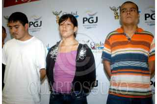 MÉXICO D.F., 01DICIEMBRE2008.- Mario Alberto Rojas Mendeaz "El mara" Claudia Vazquez Paulinal "La flaca" José Miguel Tolentino Hernández "El niño" fueron presentados en las instalaciones de la PGJDF por el delito de secuestro, motivo por lo que el procurador Miguel Angel Mancera ofrecio una conferencia a representantes de los medios de comunicación. FOTO: JULIETA MORA/CUARTOSCURO.COM