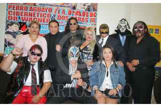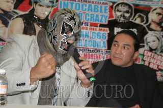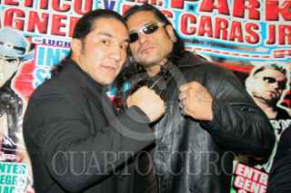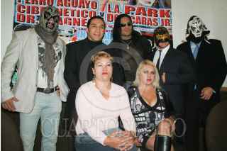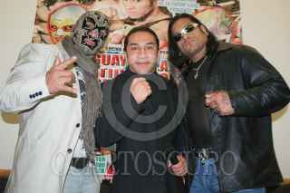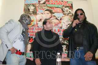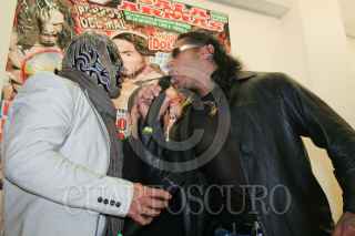 MÉXICO, D.F., 02DICIEMBRE2008.- El Hijo del Perro Aguayo y el Cibernetico durante la conferencia que se realizó en torno a la presentación de la cartelera de la nueva empresa de lucha libre -Perros del Mal-. En el lugar también hablaron acerca de sus próximas presentaciones. FOTO: ENRIQUE ORDÓÑEZ/CUARTOSCURO.COM