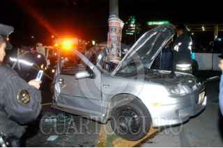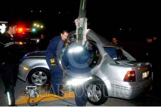 MÉXICO, D.F, 14DICIEMBRE2008.- Dos jovenes quedaron prensados entre los hierros retorcidos de su vehículo Jetta placas 254-VJY al impactarse contra un poste sobre periférico a la altura de la calle Adolfo López Mateos en la colonia Presidentes perímetro de la delegación Iztapalapa. Ambulancias especiales laboraron por mas de 40 minutos en el rescate de los jovenes que finalmente fueron trasladados a hospitales cercanos al lugar. FOTO: JULIETA MORA/CUARTOSCUROC.OM