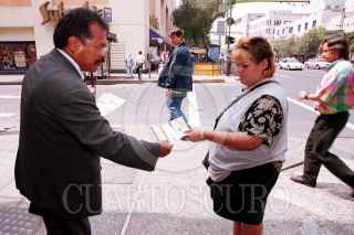 Alejandro Sánchez Camacho, coordinador y diputado perredista, se ubicó en la Av. Eje Central y 16 de septiembre para repartir volantes de propaganda sobre el plebiscito que se realizará el próximo 22 de septiembre, en torno a la construcción del segundo piso en Viaducto y Periférico. FOTO: Victoria Valtierra/CUARTOSCURO.COM