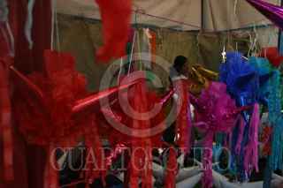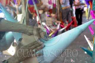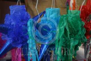 MÉXICO D.F., 22DICIEMBRE2008.- Comerciantes elaboran piñatas a base de ollas de barro, engrudo y papeles de colores, para estas fiestas navideñas el simbolismo que existe detrás de las piñatas también es variado hay quien sostiene que cada uno de los picos representa uno de los siete pecados capitales los cuales deben ser vencidos por medio de la fé y al quebrar la piñata se obtienen dulces y frutas como símbolo de la recompensa divina. El contenido de una piñata suele ser frutas de temporada como cacahuates, jícamas, naranjas, limas, tejocotes, cañas y dulces. FOTO: SÁSHENKA GUTIÉRREZ/CUARTOSCURO.COM