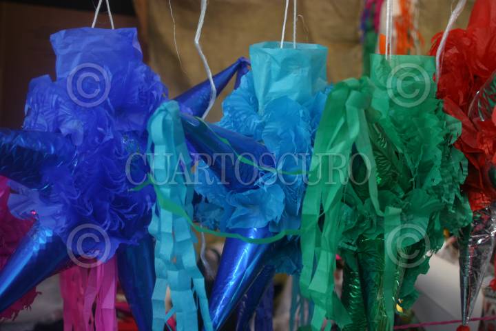 MÉXICO D.F., 22DICIEMBRE2008.- Comerciantes elaboran piñatas a base de ollas de barro, engrudo y papeles de colores, para estas fiestas navideñas el simbolismo que existe detrás de las piñatas también es variado hay quien sostiene que cada uno de los picos representa uno de los siete pecados capitales los cuales deben ser vencidos por medio de la fé y al quebrar la piñata se obtienen dulces y frutas como símbolo de la recompensa divina. El contenido de una piñata suele ser frutas de temporada como cacahuates, jícamas, naranjas, limas, tejocotes, cañas y dulces. FOTO: SÁSHENKA GUTIÉRREZ/CUARTOSCURO.COM
