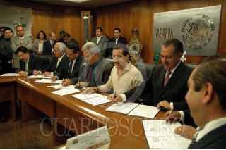 MÉXICO D.F. 23DICIEMBRE2008,- El titular de la SAGARPA Alberto Cardenas junto con 13 gobernadores firmaron este mediodía un convenio para liberar recursos para el campo durante los primeros 6 meses del año. En la imagen El goberador de Oaxaca, Ulises Ruiz, Marcelo de los Santos, gobernador de San Luis, Hector ortiz Ortiz, gobernador de Tlaxcala,, Alberto Cardenas, Titular de la Sagarpa, Ney Gonzalez, gobernador de Nayarit, y Marco Adame Castillo gobernador de Morelos. FOTO: SAÚL LÓPEZ/CUARTOSCURO.COM
