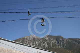 MONTERREY, NUEVO LEON, 01ENERO2008.- En la Ciudad de Monterrey, Nuevo Leon, un problema que afecta gravemente las instalaciones electricas de esta ciudad, son los objetos colgados en los cables de luz, como los son los pares de zapatos colgados. Como la imágen lo muestra, con el fondo del inponete Cerro de la Silla. FOTO: MISAEL VALTIERRA/CUARTOSCURO.COM