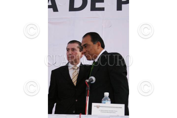 CHILPANCINGO, GUERRERO, 02ENERO2009.- En primer plano de la fila, Rene Juarez Cisneros, ex-gobernador de la entidad y tercero en la fila Manuel Añorve Baños, alcalde de Acapulco, durante la ceremonia de toma de protesta de Hector Astudillo Flores como alcalde de Chilpancingo en la plaza civica "Primer Congreso de Anahuac" de la capital del estado. FOTO: OSCAR ALVARADO/CUARTOSCURO.COM