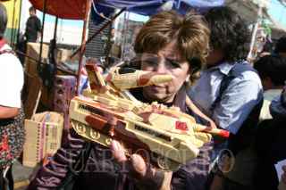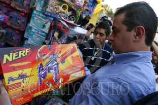 MÉXICO, D.F., 03ENERO2009.- Los diputados locales María del Carmen Segura Rangel y Agustín Castilla realizaron un recorrido por calles del centro histórico en donde en esta temporada se venden juguetes bélicos. El objetivo es combatir y evitar la venta ilegal e irregular de juguetes con forma de arma de fuego, pues muchas veces son utilizados para cometer actos ilícitos por sus características similares a las reales. FOTO: RODOLFO ANGULO/CUARTOSCURO.COM