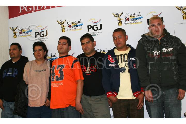 MÉXICO, D.F., 08ENERO2009.- Esta tarde fueron presentados ante los medios de comunicación, José Franco y José Gómez , de 24 años de edad; Fernando Pérez Lazcano de 20 años; Javier Briones y Victor Villalobos, de 37 y Guillermo Carrillo de 39, por el presunto delito de falsificación de documentos y uso de documento falso. Estos individuos fueron detenidos en las inmediaciones de las oficinas centrales del Registro Civil, donde se les encontro 52 documentos apócrifos. FOTO: MISAEL VALTIERRA/CUARTOSCURO.COM