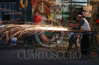 ECATEPEC, ESTADO DE MEXICO, 08ENERO2009.- Un herrero lima una estructura de metal que parece ser una puerta en la calle llenando con chistas incandescentes el espacio donde trabaja. FOTO:RICARDO CASTELAN/CUARTOSCURO.COM