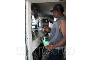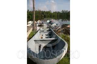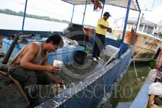 CENTLA, TABASCO, 08ENERO2009.- A pesar de la actual situación critica que pasa el sector pesquero con el alza del diesel, unos tripulantes de embarcaciones camaroneras aprovechan el tiempo para darle una manita de gato y hacer pequeñas reparaciones al barco camaronero. FOTO: MARCO POLO GUZMÁN HERNÁNDEZ/CUARTOSCURO.COM