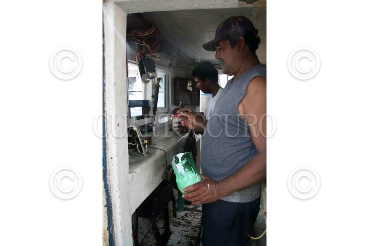 CENTLA, TABASCO, 08ENERO2009.- A pesar de la actual situación critica que pasa el sector pesquero con el alza del diesel, unos tripulantes de embarcaciones camaroneras aprovechan el tiempo para darle una manita de gato y hacer pequeñas reparaciones al barco camaronero. FOTO: MARCO POLO GUZMÁN HERNÁNDEZ/CUARTOSCURO.COM