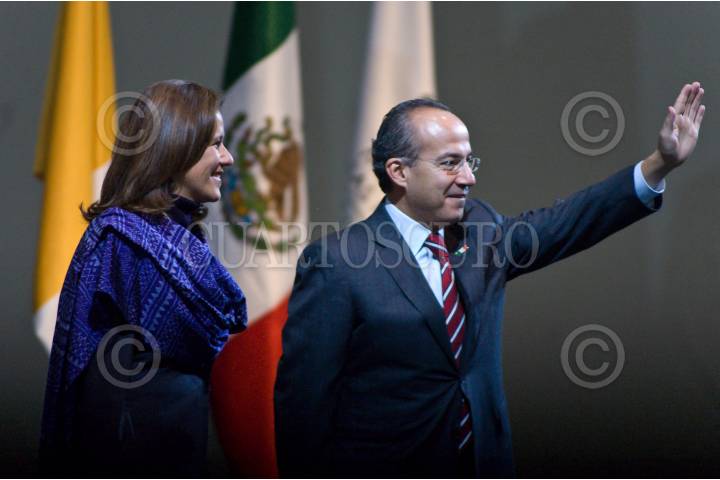 MÉXICO D.F., 14ENERO2009.- Monseñor Carlos Aguiar Retes, el cardenal Ennio Antonelli, el presidente Felipe Calderón acompañada de su esposa Margarita Zavala y el Cardenal Norberto Rivera Carrera durante la sesión inaugural del VI Encuentro Mundial de las Familias 2009 que se realiza en el Centro de Exposiciones Bancomer del 14 al 18 Enero. FOTO: RODOLFO ANGULO/CUARTOSCURO.COM