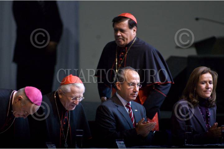 MÉXICO D.F., 14ENERO2009.- Monseñor Carlos Aguiar Retes, el cardenal Ennio Antonelli, el presidente Felipe Calderón acompañada de su esposa Margarita Zavala y el Cardenal Norberto Rivera Carrera durante la sesión inaugural del VI Encuentro Mundial de las Familias 2009 que se realiza en el Centro de Exposiciones Bancomer del 14 al 18 Enero. FOTO: RODOLFO ANGULO/CUARTOSCURO.COM