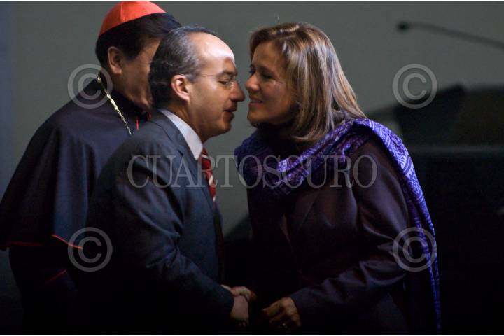 MÉXICO D.F., 14ENERO2009.- Monseñor Carlos Aguiar Retes, el cardenal Ennio Antonelli, el presidente Felipe Calderón acompañada de su esposa Margarita Zavala y el Cardenal Norberto Rivera Carrera durante la sesión inaugural del VI Encuentro Mundial de las Familias 2009 que se realiza en el Centro de Exposiciones Bancomer del 14 al 18 Enero. FOTO: RODOLFO ANGULO/CUARTOSCURO.COM