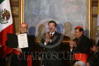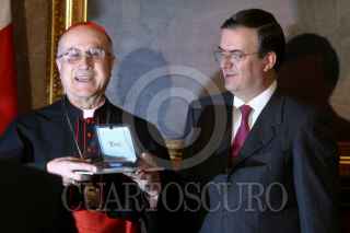 MÉXICO, D.F., 20ENERO2009.- El secretario de Estado Vaticano cardenal Tarcisio Bertone Marcelo Ebrard Jefe de Gobierno, y el Cardenal Norberto Rivera se despiden de los medios de comunicación, después de que Marcelo Ebrard entregara al representante del Vaticano la Declaratoria de Huésped Distinguido FOTO: SÁSHENKA GUTIÉRREZ/CUARTOSCURO.COM