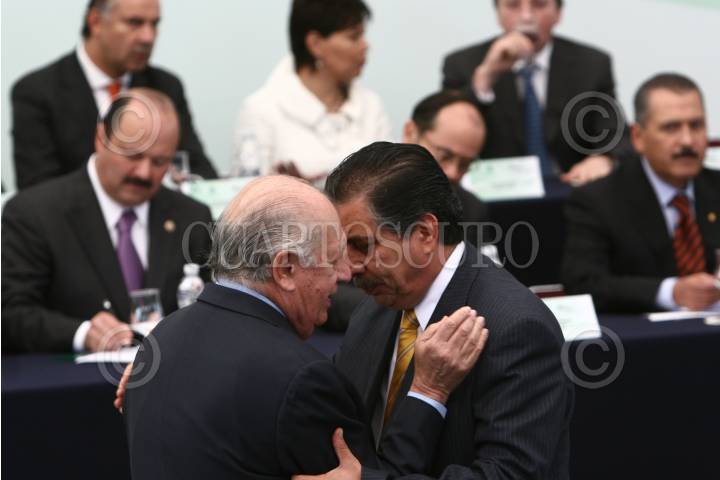 MÉXICO, D.F., 27ENERO2009.- Guillermo Ortiz Martínez, Gobernador del Banco de México, Gustavo Madero, Presidente de la Mesa Directiva del Senado y Agustín Carstens, Secretario de Hacienda, al finalizar el primer día de actividades de el foro "México Ante la Crisis: ¿Qué Hacer Para Crecer?" organizado por el Senado de la República. El encuentro de ideas se realizó en el Alcazar de Chapultepec y tuvo como anfitrión a la Cámara de Senadores. FOTO: MOISÉS PABLO/CUARTOSCURO.COM