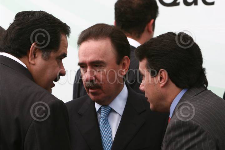 MÉXICO, D.F., 27ENERO2009.- Guillermo Ortiz Martínez, Gobernador del Banco de México, Gustavo Madero, Presidente de la Mesa Directiva del Senado y Agustín Carstens, Secretario de Hacienda, al finalizar el primer día de actividades de el foro "México Ante la Crisis: ¿Qué Hacer Para Crecer?" organizado por el Senado de la República. El encuentro de ideas se realizó en el Alcazar de Chapultepec y tuvo como anfitrión a la Cámara de Senadores. FOTO: MOISÉS PABLO/CUARTOSCURO.COM