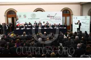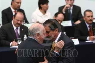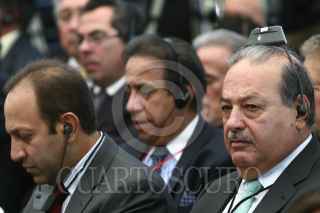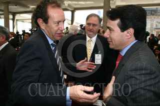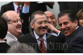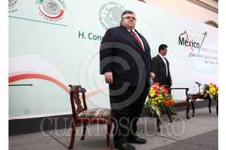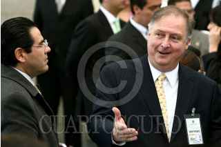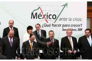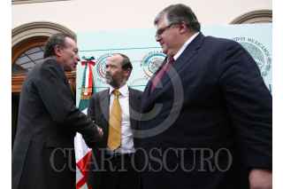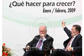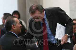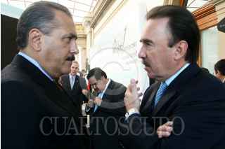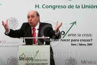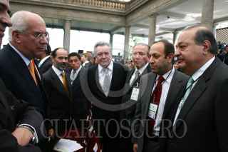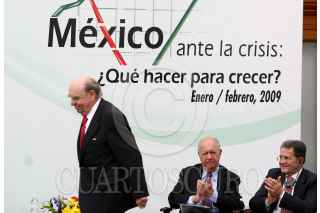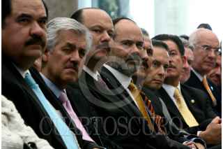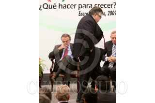 MÉXICO, D.F., 27ENERO2009.- Guillermo Ortiz Martínez, Gobernador del Banco de México, Gustavo Madero, Presidente de la Mesa Directiva del Senado y Agustín Carstens, Secretario de Hacienda, al finalizar el primer día de actividades de el foro "México Ante la Crisis: ¿Qué Hacer Para Crecer?" organizado por el Senado de la República. El encuentro de ideas se realizó en el Alcazar de Chapultepec y tuvo como anfitrión a la Cámara de Senadores. FOTO: MOISÉS PABLO/CUARTOSCURO.COM