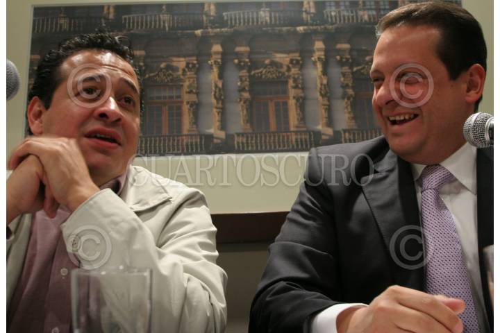MÉXICO D.F., 28ENERO2009.- Los legisladores Enrique Pérez Correa y Jorge Díaz Cuervo, bromean en un lapso de la conferencia de prensa ofrecida por el Partido Social Demócrata, en la cual abordaron el tema de la convivencia entre fumadores y no-fumadores en lugares públicos y la reciente ley en la que se restringe la venta de bebidas en los bares hasta las 02:30 a.m. y su cierre máximo a las 03:00 a.m., lo que señalaron que en lugar de inhibir la corrupción esta se agravará. FOTO: RICARDO CASTELAN/CUARTOSCURO.COM