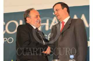 MÉXICO, D.F., 28ENERO2009.- Efrén Ocampo López, Presidente Ejecutivo del Grupo Farmacéutico Neolpharma y Marcelo Ebrard Casaubón, Jefe de Gobierno, durante la inauguración de la primera planta citada farmacéutica, ubicada en la delegación Azcapotzalco, en la zona industrial de Vallejo, la cual generará 545 empleos directos para beneficio de los capitalinos. FOTO: CUARTOSCURO.COM