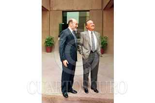 El presidente del Partido Acción Nacional Luis Felipe Bravo Mena muestra el edificio a Ernesto Ruffo al término de su conferencia semanal FOTO: Susana Navarrete/CUARTOSCURO.COM