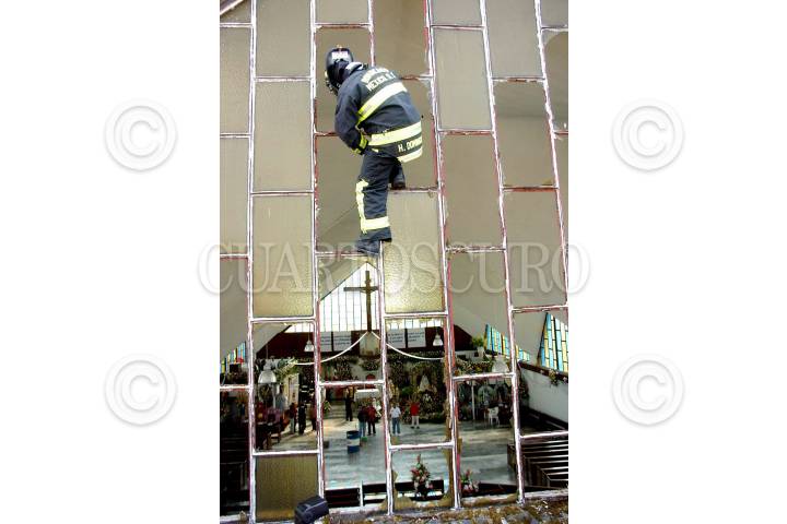 MÉXICO, D.F., 02FEBRERO2009.- Personal del cuerpo de bomberos acudió a la Iglesia de la Candelaria donde esta tarde explotó un cuetón cuando los feligreces asistian a la bendición de los niños dios la iglesia se encuentra ubicada en la calle de Coahuila y Juarez en el centro de Cuajimalpa. FOTO: JULIETA MORA/CUARTOSCURO.COM