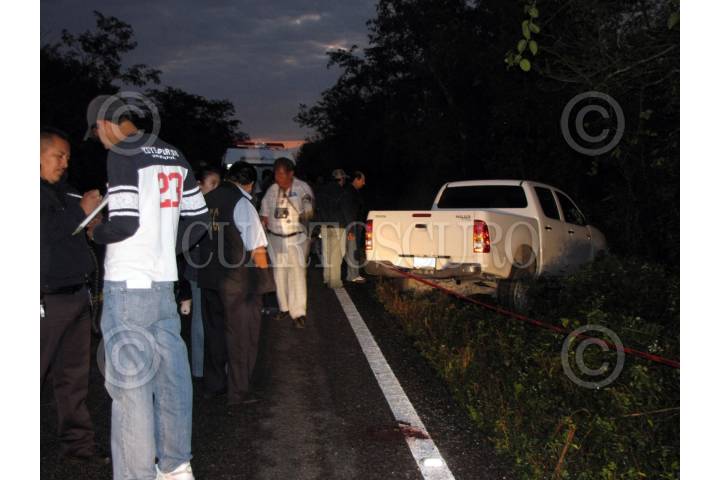 CANCÚN, QUINTANA ROO, 03FEBRERO2009.- Imágen de la camioneta color blanca marca Toyota tipo Helux con placas de circulación TA80162, que fue baleada a ráfagas, por los que sus ocupantes de nombres Cesar Román Zúñiga, oficial mayor de la Secretaria de la Defensa Nacional, el general de brigada Mauro Enrique Tello Quiñonez y Juan Ramírez Sánchez, quienes eran asesor jurídicos de la Secretaria de Seguridad Pública en el estado pierden la vida. Los hechos delictivos se registraron alrededor de las 03:00 de hoy cuando una camioneta color blanca marca Toyota tipo Helux con placas de circulación TA80162 fue baleada a ráfagas, por los que sus ocupantes de nombres Cesar Román Zúñiga, oficial mayor de la Secretaria de la Defensa Nacional, el general de brigada Mauro Enrique Tello Quiñonez, y Juan Ramírez Sánchez, quienes eran asesor jurídicos de la Secretaria de Seguridad Pública en el estado pierden la vida. FOTO: ESPECIAL/CUARTOSCURO.COM